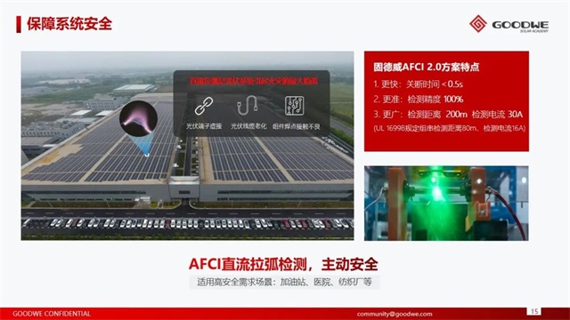 隨著分布式光伏大踏步前行,對于光伏系統的安全性也提出更高要求,固德威推出了一系列智慧安全解決方案,直流拉弧檢測技術AFCI2.0,行業領先,具有更快、更準、更廣的特點,小于0.5s快速關斷、檢測精度100%、檢測距離200m、檢測電流30A;RSD快速關斷技術,在緊急情況下,逆變器關機或者電網斷電,可觸發組件電壓0V快速關斷,為業主、安裝維護人員、消防員提供更高的人身安全保障。