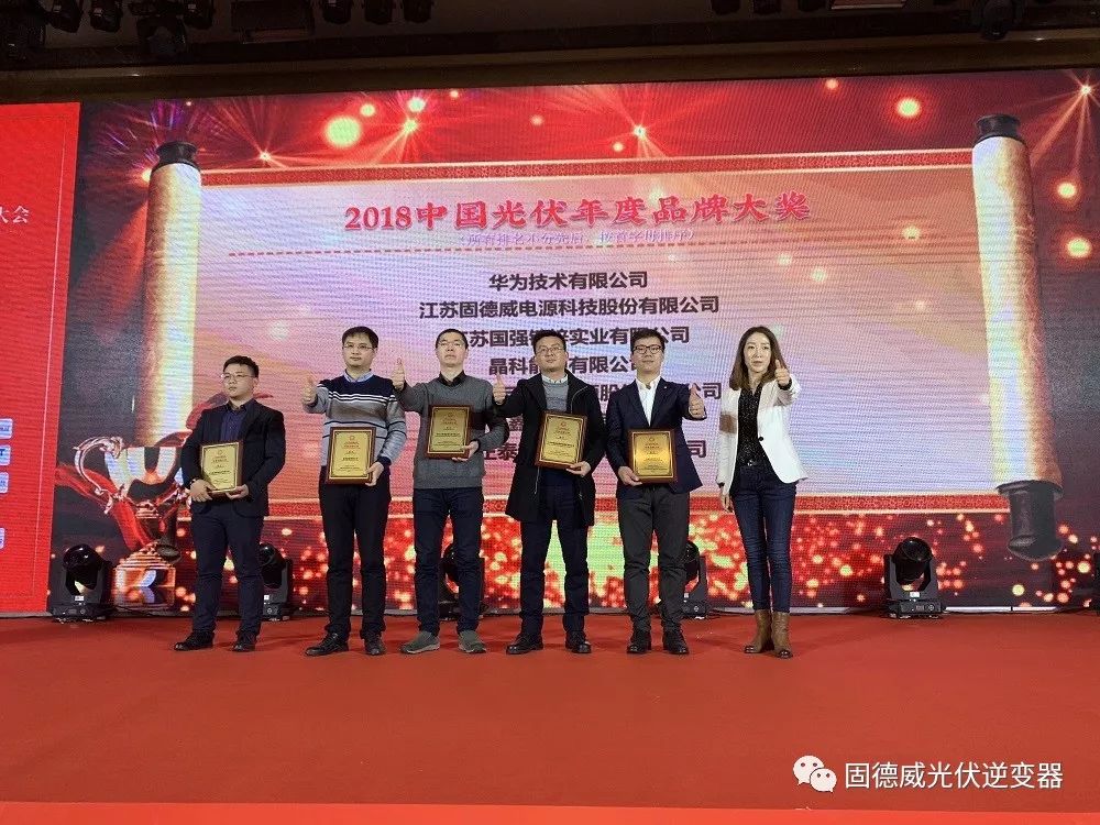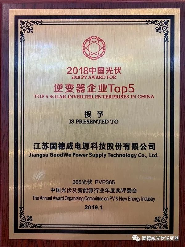 1月4日,由365光伏、協鑫集團及國合洲際能源咨詢院聯合主辦的“第六屆中國光伏年會暨2018分布式能源創新應用大會”隆重舉行。固德威實力斬獲“2018中國光伏年度品牌大獎”、“2018中國光伏逆變器企業TOP5”兩項重磅大獎。
