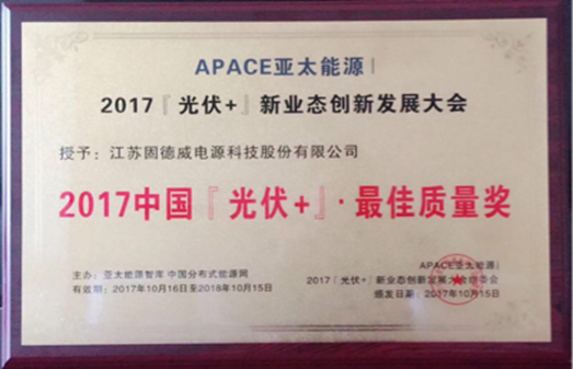 2017年10月15日,APACE亞太能源2017『光伏+』新業(yè)態(tài)創(chuàng)新發(fā)展大會在北京市順義區(qū)舉行,江蘇固德威電源科技股份有限公司作為受邀嘉賓參加此次論壇會議,并一舉斬獲“2017光伏+最佳質(zhì)量獎”。