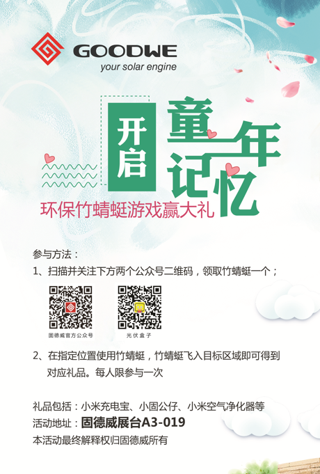 屆時您可以隨時來CREC展會的固德威展臺,了解光伏行業最新動態這里有最舒適的洽談環境,最前沿的光伏產品和最專業的知識分享,更有好禮不斷送出,小固公仔、空氣凈化器、充電寶等禮品等你來拿。展位現場更有好玩有趣的有獎互動游戲,期待您的參與。我們在A3-019展位等著你!同期,固德威太陽能學院將于11月1日在無錫君來世尊酒店開展光伏應用培訓。期待您的光臨!