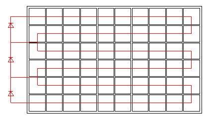 以60片電池片為例,實際上就是3組電池片并聯,每組20塊電池板串聯接一個旁路二極管,二極管可以防止熱斑,在一串被遮擋的時候對其他兩串沒有影響。根據組件特性,來分析不同遮擋下的出力情況。