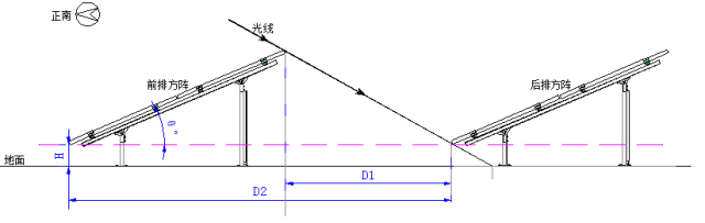 假設組件是1650*990mm的單晶280Wp(60片)的組件,組件安裝傾角為θ,光線入射角為α,則D2=L*cosθ+L*sinθ*cotα。