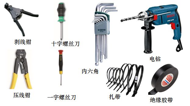 工具:吊裝工具(腳手架)、扎帶、活動扳手、電動工具(套筒、)、內(nèi)六角一套、螺絲刀(一字、十字)、絕緣膠帶、剝線鉗、壓線鉗、老虎鉗、萬用表等。