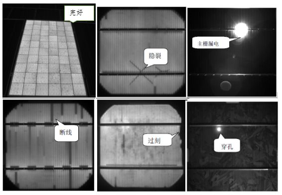 EL檢測儀是光伏電站檢測設(shè)備,能夠準(zhǔn)確檢測出光伏太陽能板內(nèi)部質(zhì)量問題,包括:斷柵、隱裂、破片、碎片、虛焊、燒結(jié)網(wǎng)紋、黑芯、黑邊、混檔、低效率片、邊緣過刻、PID、衰減、熱斑衰減等狀況,如下圖。