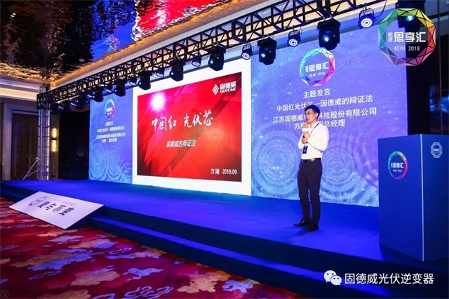 固德威作為主要戰(zhàn)略支持單位,總經理黃敏先生,副總經理方剛先生,副總經理侯祥勇先生等悉數到場助陣。方總以“中國紅,光伏芯”做主題發(fā)言,講述固德威的企業(yè)成長辯證法,獲得陣陣掌聲。固德威也以“中國紅,光伏芯”品牌形象成為論壇焦點,備受矚目。