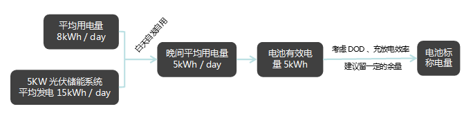 最理想狀態是,光伏+儲能系統能夠完全覆蓋家庭用電。但是這種情況很難實現。所以我們綜合考慮投入成本和用電情況,可以選擇根據家庭平均日用電量(kWh)來選擇電池的容量(默認光伏系統能量充足)。設計邏輯如下 :