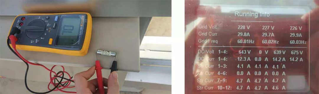 處理結(jié)果:現(xiàn)場(chǎng)查看屏幕,發(fā)現(xiàn)PV2無(wú)電壓,拔開(kāi)端子用萬(wàn)用表檢測(cè)電壓正常,重新插上,DC開(kāi)關(guān)也處于“ON”狀態(tài),打開(kāi)逆變器下蓋,測(cè)得匯流板出去的電壓值為0,最后測(cè)出熔絲處于開(kāi)路狀態(tài) ,更換保險(xiǎn)絲后,逆變器正常工作。