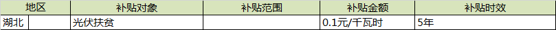 補貼對象和金額:對2016年1月1日至2019年12月31日期間建成的光伏扶貧項目實行電價補貼。給予每千瓦時0.1元補貼,補貼時間為5年。