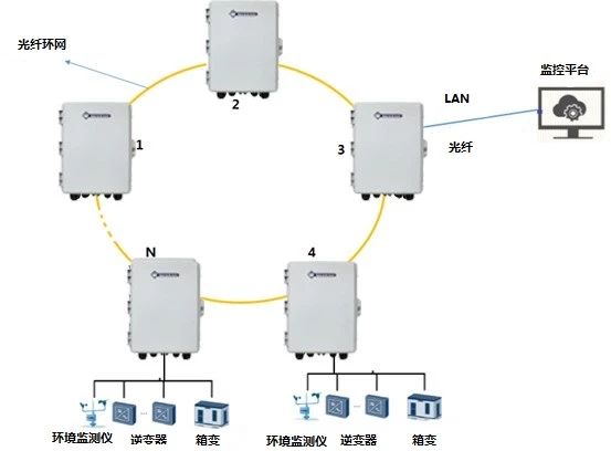 光纖環網:通過光纖把各個光伏光纖終端盒連接起來組成環網,交換機通過網線與數據采集器連接。當環網中的任一光纖出現中斷時,對于主站接收數據沒有影響,不會出現通訊斷鏈、數據丟失的情況;并且光纖的傳輸相對速率更快,傳輸距離能夠達到20km。