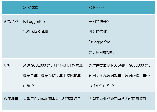SCB2000光伏通信箱與固德威逆變器配合使用,可以實現PLC的通訊方式,主要應用于大型工商業或地面電站項目。SCB2000光伏通信箱內部集成了PLC通信板、Ezlogger Pro數據采集器、光纖環網交換機。