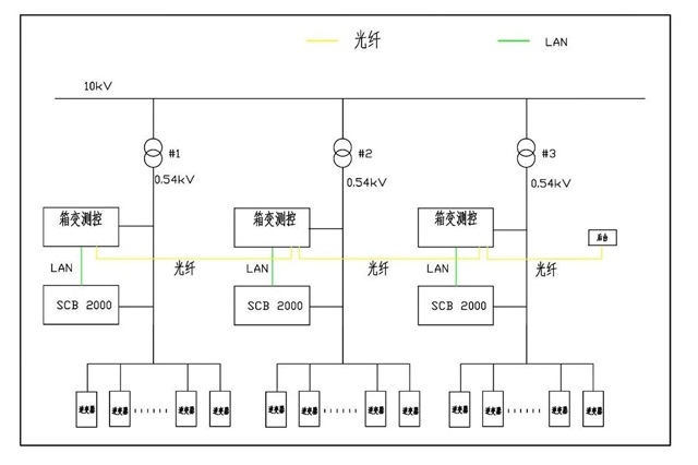 此項目中,SCB2000通訊箱通過PLC監控采集逆變器數據再通過LAN網線將數據傳送到箱變測控,箱變測控光纖環網,將數據最終傳入后臺主交換機。