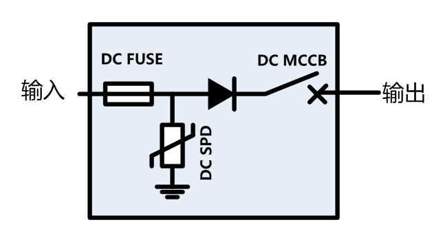 1、需要在組件和逆變器之前配備直流匯流箱(或叫“光伏陣列防雷匯流箱”),每個支路必須有直流熔斷器、阻流二極管(阻流二極管接于正極)、直流斷路器、浪涌保護器,如下圖所示;