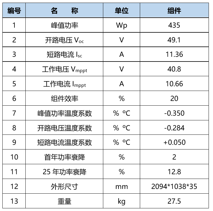 使用某高效雙面太陽能電池組件104104塊,組件規格為435Wp,裝機容量為45285.24kWp。