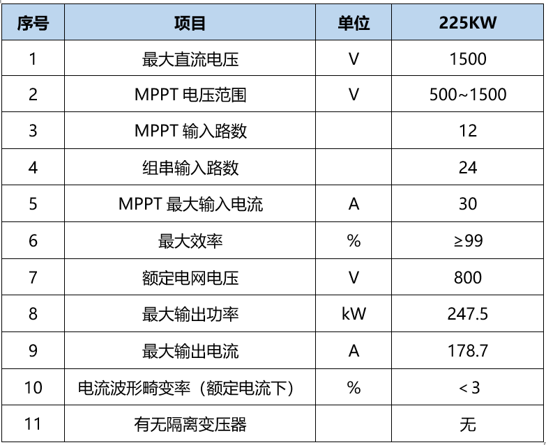 本項目采用1500V組串式逆變器,目前1500V組串式逆變器有多種型號。本工程采用單機容量225kW的逆變器。