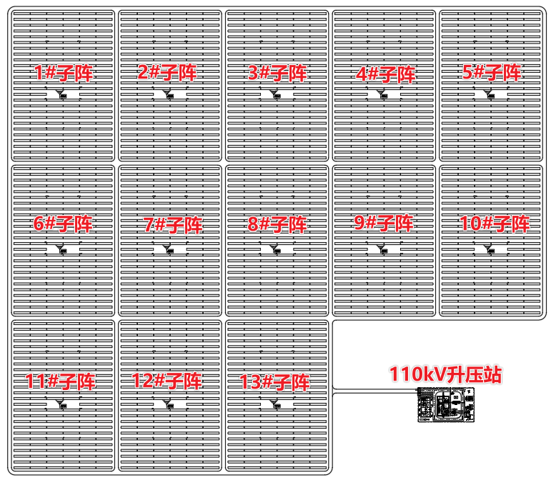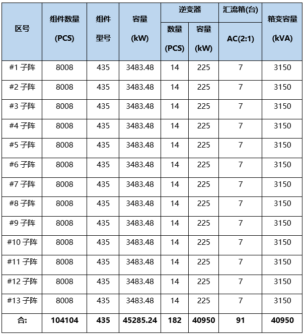 本項目共分為13個子陣單元,每個子陣單元光伏組件數量為8008塊,裝機容量為3483.48kW;
