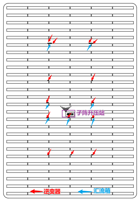 子陣單元共使用225kW組串式光伏逆變器14臺,每臺逆變器接入22串光伏組串,每串組串由26塊組件構成;
