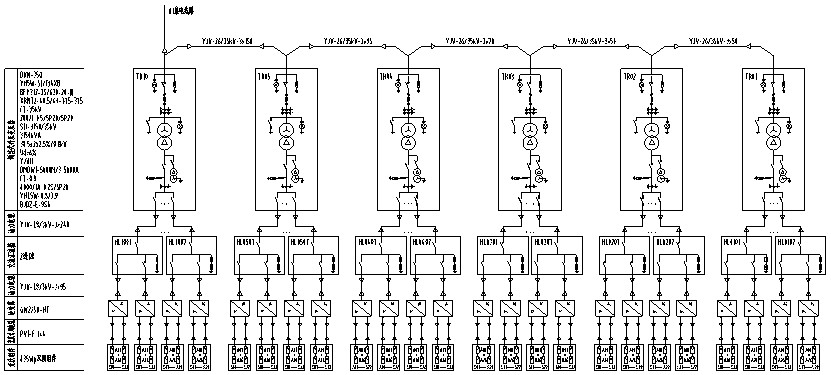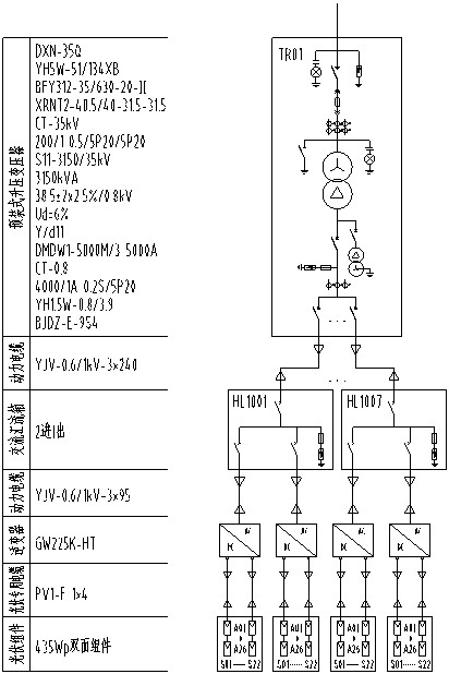 子陣中央配置一套35kV升壓設備,包括0.8kV低壓進線柜、35kV高壓出線、0.8/35kV油浸式變壓器。配置信息如下: