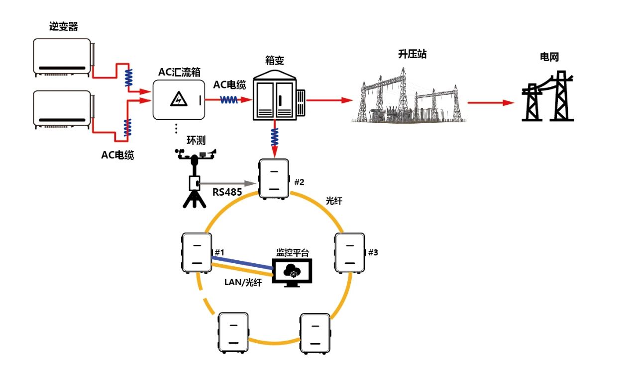 光伏場區內逆變器采用PLC(電力載波)通信方式,在每個子陣35kV升壓箱變內配置1臺智能通訊箱,由該設備將動力電纜中的通信數據分離,通過光纖環網的形式將光伏、環測數據發送到場區監控系統。