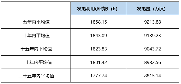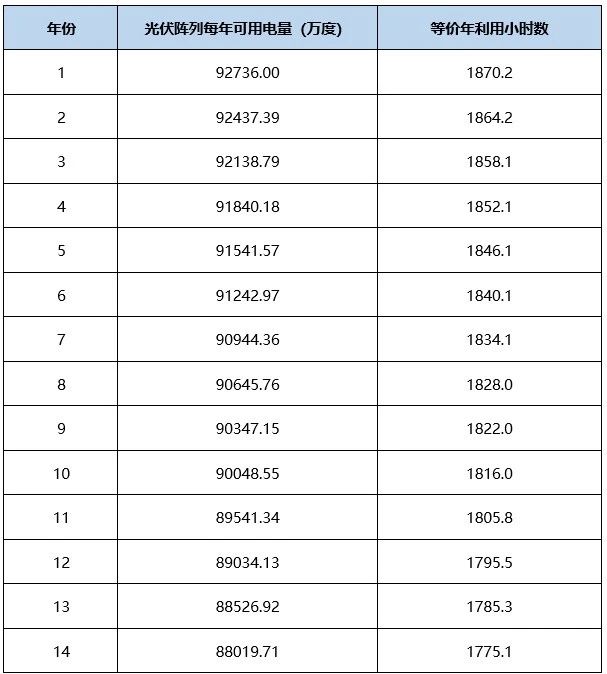 光伏組件的功率是存在衰減的,本項目采用高效雙面單晶硅組件,首年衰減為2%,之后每年衰減0.55%。考慮光伏組件的衰減,光伏電站年發電量及年利用小時數見下表所示。