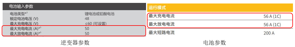 在設計儲能系統時,逆變器和電池的同一參數是否匹配是非常重要的。如果參數并不匹配,系統便會遵循較小的數值來運行。特別是在備用電源模式下,設計者應根據較低的數值來進行電池充放電速度以及供電能力的計算。例如,若將下圖所示的逆變器和電池匹配使用,系統的最大充放電電流便為50A。