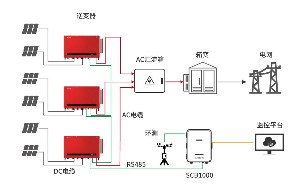 SCB1000通訊箱采用RS485串口通訊方式,可提供4個串口和1個LAN口,串口可接入逆變器、箱變測控、電度表、環境監測儀等采用標準modbus協議的第三方設備。LAN口負責將數據通過IEC104協議傳輸至站控系統和SCADA系統。