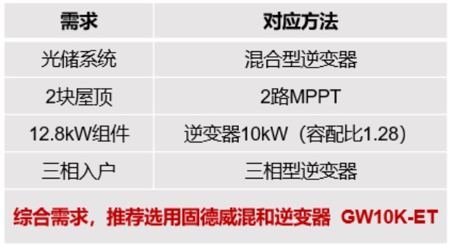 綜合組件參數(shù)、房屋的硬性條件,以及用戶對整個系統(tǒng)的需求。推薦使用混合逆變器GW10K-ET。