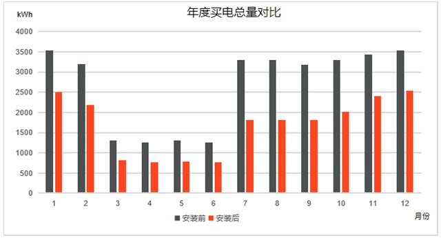 對比安裝光儲前后的買電量,可看出整體買電量削減,夏季甚至最高削減50%左右。