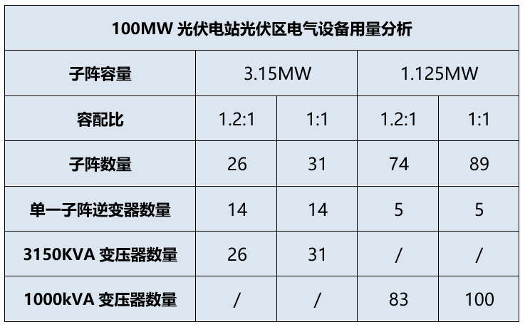 采用大子陣、高容配比的設計方案,減少整個項目的子陣數量可以有效的節約光伏區箱變的使用量及安裝量,從而降低系統建設成本。例如一個100MW電站進行不同容量子陣和容配比的比較,如下表: