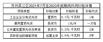 2021年11月19日,吳江區人民政府發布如下補貼政策:全區新建及改擴建工業廠房項目,全部建設屋頂光伏發電設施。現有工業企業屋頂面積10000平方米以上,或年綜合能耗1000噸標煤(當量值)以上,或年用電量200萬千瓦時以上,在滿足荷載條件的前提下,應安裝屋頂光伏發電設施。鼓勵裝機容量2兆瓦以上的光伏項目按照不低于裝機容量8%的比例配建儲能系統,支持發展集中式儲能項目。具體補貼如下: