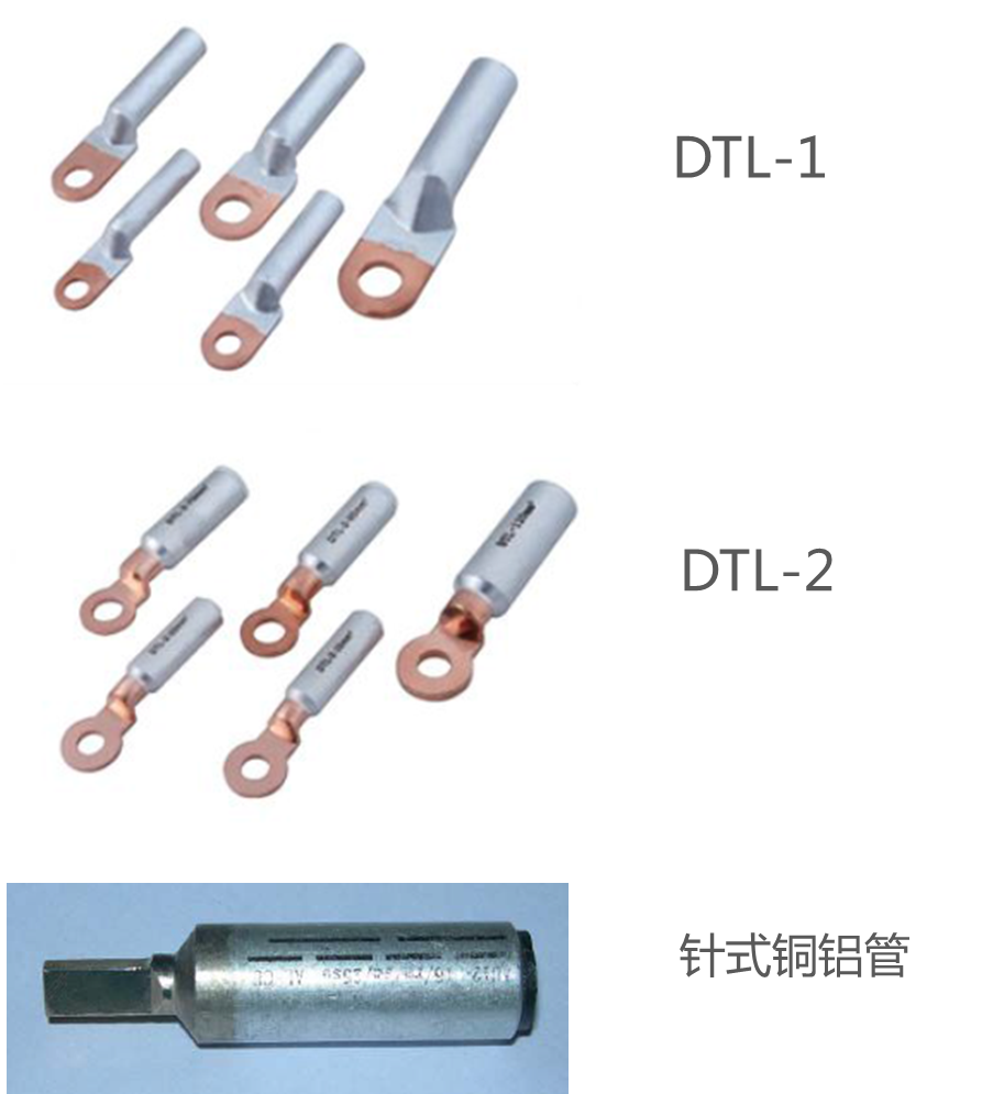 l? 銅鋁過渡端子:是目前廣為采用的一種用于鋁線纜和鋁合金線纜的端子,端子的構(gòu)成分為兩部分,一端為用于連接鋁線和鋁合金線纜,一端為用于連接成套電氣或其他電力終端,常見的銅鋁過渡端子根據(jù)形狀分為:DTL-1,DTL-2和針式銅鋁管。