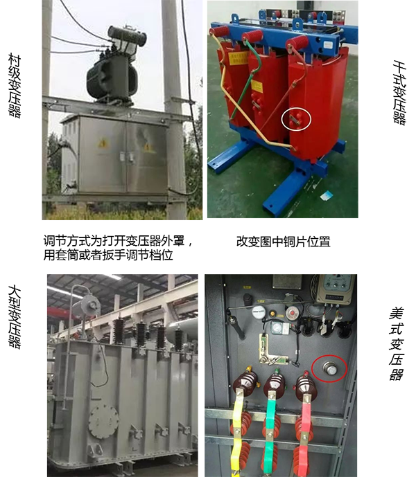 常見的變壓器多具備調(diào)檔功能,即通過改變一次側(cè)的接入線圈,在一定范圍內(nèi)調(diào)節(jié)二次側(cè)的輸出電壓,而調(diào)節(jié)范圍和調(diào)節(jié)方法由變壓器型號(hào)和分接檔位決定,由于該項(xiàng)操作屬于電網(wǎng)公司范疇,小固在這里只對(duì)幾種變壓器做簡(jiǎn)單概述: