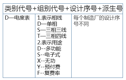 電度表型號用字母和數字的排列表示“類別代號+組別代號+設計序號+派生號” 。例如DTS1032型表示三線四線電子式電表。