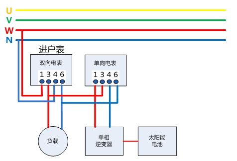 自發自用,余電上網即光伏發的電先給自己使用,多余的電賣給電網。該模式下需要一個單向計量的電表,還需要把進戶電表換成雙向計量的電表,如下圖所示。