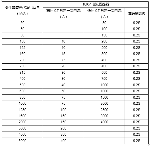 2.高壓計量電流互感器的一次額定電流,應按總配變容量、光伏發電接入容量確定。計量電流互感器配置參考如下表 。